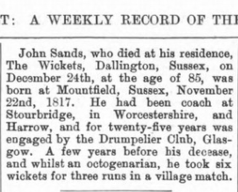 Full name: John Sands. Born: 22nd November 1822, Mountfield, Sussex, England. Died: 24th December 1902, Dallington, Sussex, England.died December 1902.