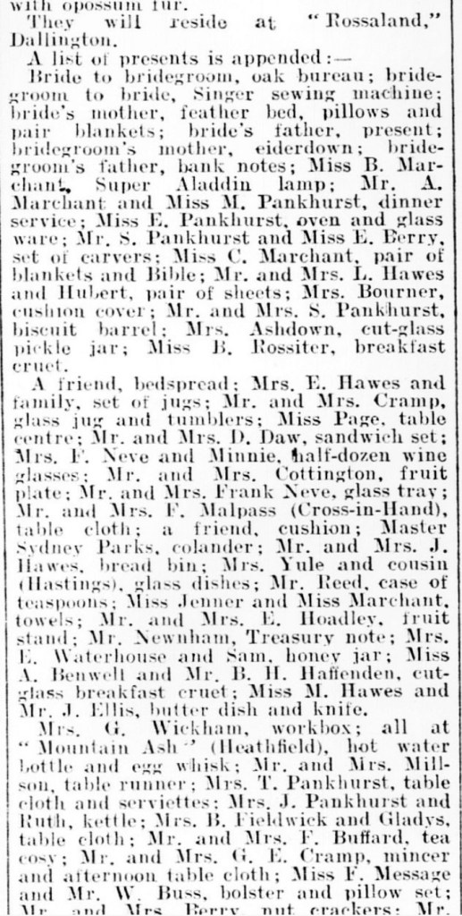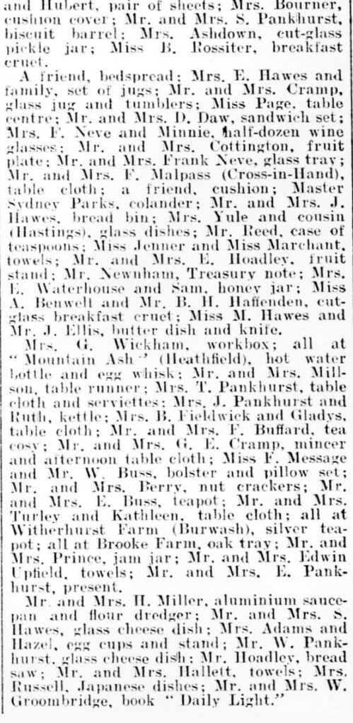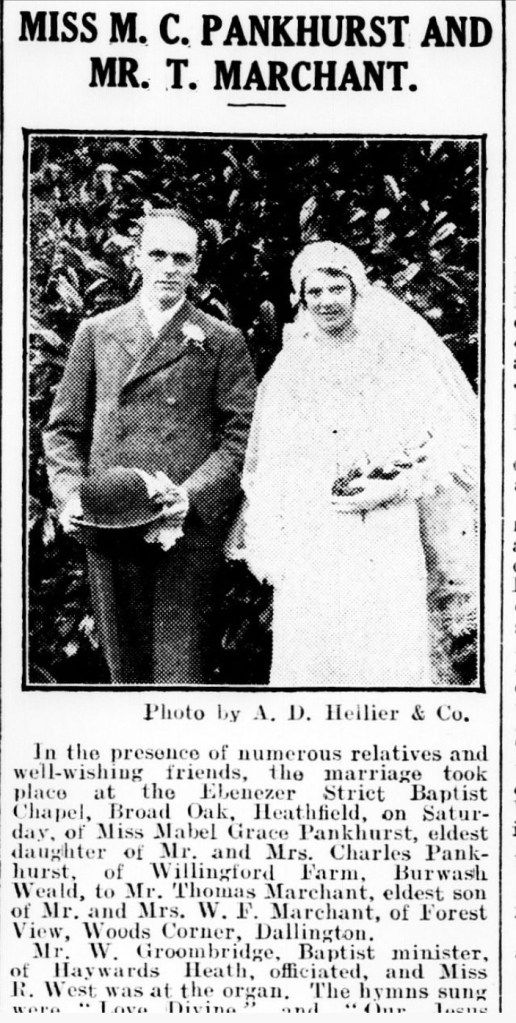 Information & newspaper cutting from Sussex Express 1932 and kindly provided by present owner, Lisa Simmonds. “…our house, Woods Place was once named Rosaland Cottage. Thomas Marchant lived here until his death in the late 1980s. He lived here with his wife, Mabel Pankhurst from 1932. What’s more curious for me, is not only am I related to George Sands who built the house (and Forest View), Mabel is actually my first cousin X3 removed! They had their wedding reception at Forest View next door (where Thomas’s parents lived)”