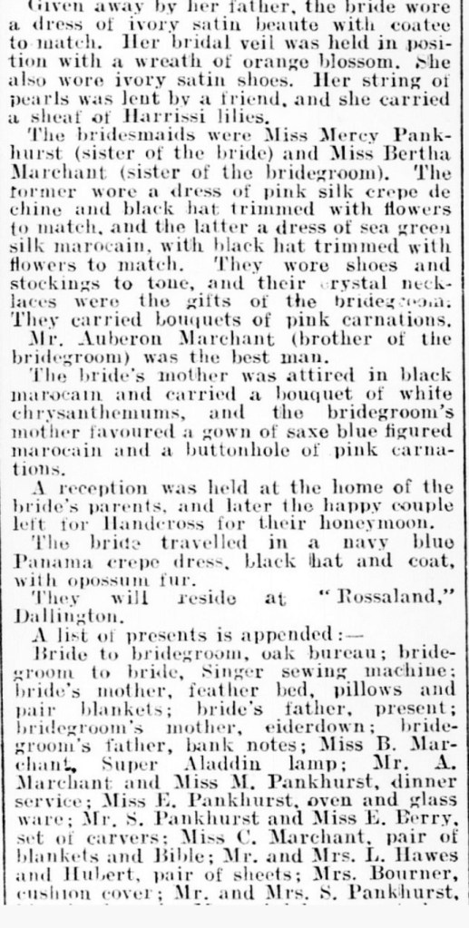 The detailed description of the bride’s dress and list of presents provides interesting social history: