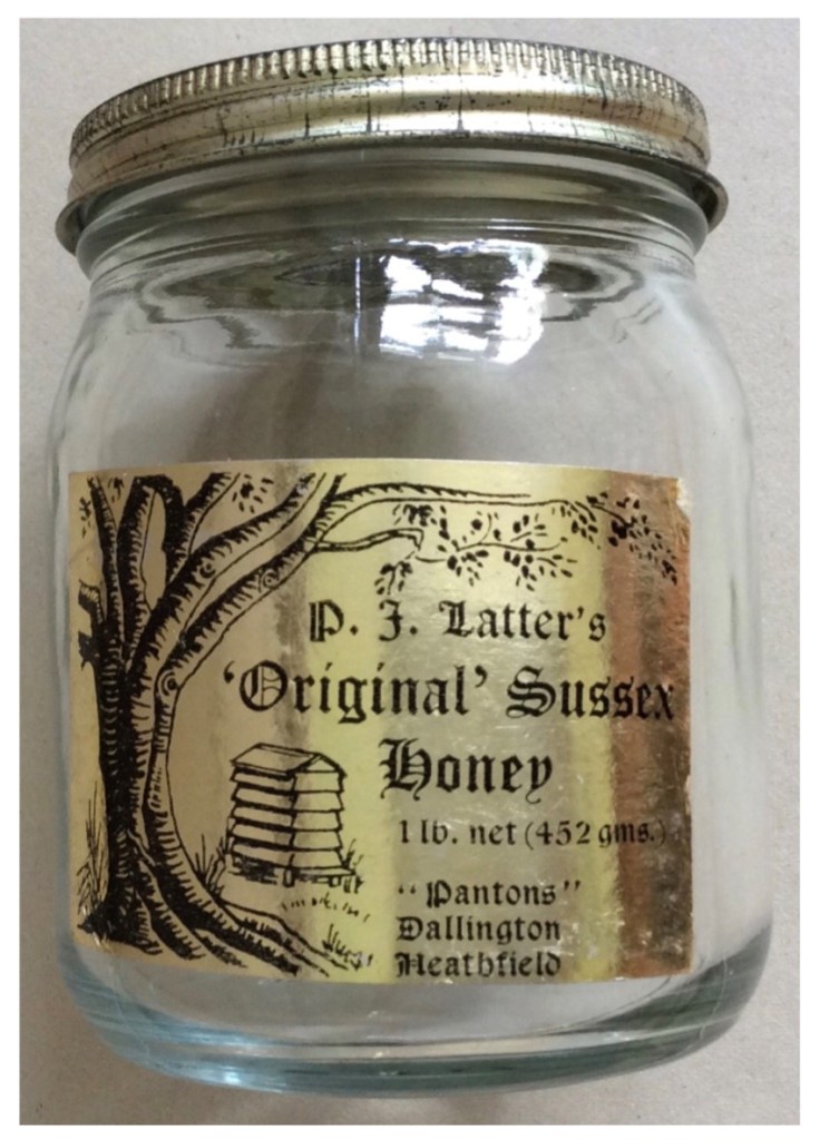 “Another close friend, Phil Latter, would often call to see us…, stooping low to clear the door and doffing his trilby with an ‘Evening all’. As a young policeman he was seconded to Dallington in 1938 and lodged at Four Winds, where he still lived when we first met him in the late 1960s. By then his time was spent on his small holding at Dallington from where he sold fruit and veg. He’d often be sat in his armchair in the Coach House, a big old building crammed full of gardening tools. Once we found him in his beekeeping suit. He sold honeycomb and pots of honey locally, as well as to Fortnum and Mason. The gold and black label on the honey jars – ‘P J Latter’s Sussex Honey’ – was designed by my mother and included a pen and ink drawing of his beehives“