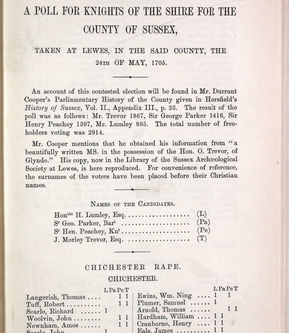 In 1705 the poll was taken at Lewes, where polling took place in the old town hall and in four wagons, and the candidates were Sir Henry Peachey, a Whig, and Henry Lumley, a moderate Tory, both from the west, and from the east, Sir George Parker, a Tory and John Morley Trevor, a Whig.