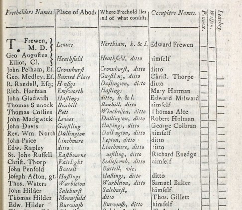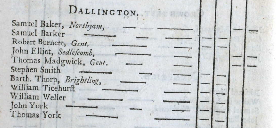 The Dallington section of the Poll Book shows who could vote (placenames in italics refer to land owned outside Dallington) and how they voted. Three men, Samuel Baker, John Elliott and Thomas Madgwick, voted for the two ‘opposition’ candidates, but the others (Samuel Barker, Robert Burnett, Stephen Smith, Bartholomew Thorp, William Ticehurst, William Weller, John York and Thomas York) voted for Newcastle’s preferred candidates, who were duly elected. We do not know whether they did so from conviction or ‘personal interest’.