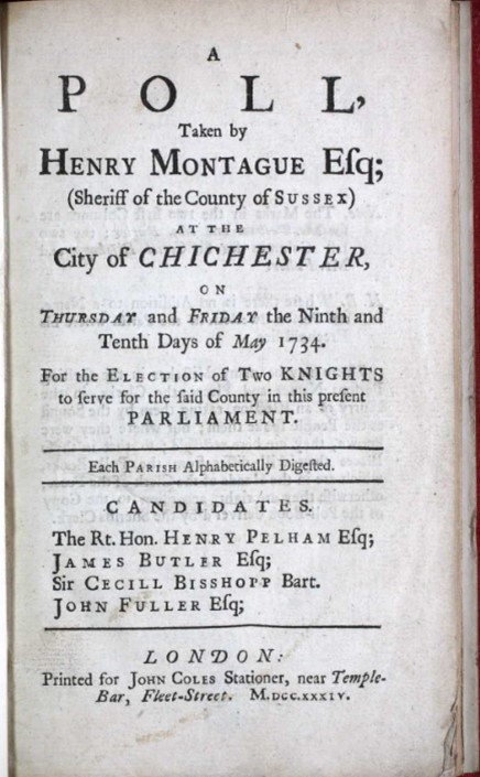 For nearly twenty years there were no more contests in Sussex, one of the seats being held by Newcastle’s brother, Henry Pelham, representing the eastern division of Sussex, the other by James Butler, representing the western division.