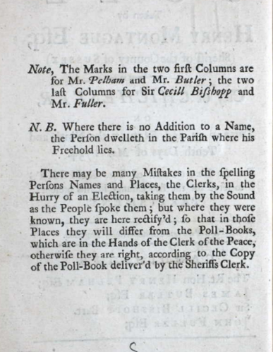 Pelham and Butler kept their seats unopposed for several years, only replaced after Butler’s death by his son John. Indeed during the Duke of Newcastle’s lifetime (d 1768) one Member was always a Pelham and the other usually a country gentleman friendly to the Pelhams.