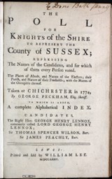 In order to replace an unpopular sitting MP, Richard Harcourt, a meeting of Sussex freeholders adopted Sir Thomas Spencer Wilson as candidate in spite of his reluctance and declaration that ‘he would not be at any expense, either in carrying, supporting, or ornamenting any voter, or on any other account, except the legal expenses of the poll’. The freeholders ‘entered into voluntary subscriptions for the support of their cause’ and the poll lasted twenty-four days. Wilson’s expenses amounted to only £720, and his notes showed his contempt for the whole process: